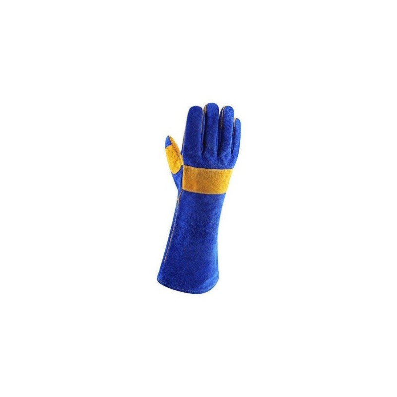 Gloves, committed to providing each customer with the highest standard of customer service. If you have any issue with our gloves at any time, please always contact us first before leaving feedback/review. We will strive to fix the issue to your full Satisfaction Guaranteed. Specifications Condition: New Material: Leather Color: Blue - Yellow palm - Denim jean cuffs Dimensions: 14In (Long) Included: 1 Pair Product Features 100% Split Leather - Made from carefully selected high-quality leather, material is naturally breathable, sweat-absorbent, and comfortable. The heat and flame resistant leather with double layer palms designed to protect you from fingertip to forearm. High quality leather with thickness above 1.2mm, 14 inches extra long glove protect your forearms from grinding debris, welding sparks, hot coals and open flames, hot kitchen ware and hot steam. Soft and flexible with moderate oil resistance, fire resistant, puncture resistance and cut resistance, also with thermal protection and insulation properties. Scope of application Unisex gloves, ideal for welding, wood stove, fireplace, animal handling, fire pit, cutting, gardening, yard work, fencing, landscaping, lumber, construction, ranching, farm, machinery and so on.